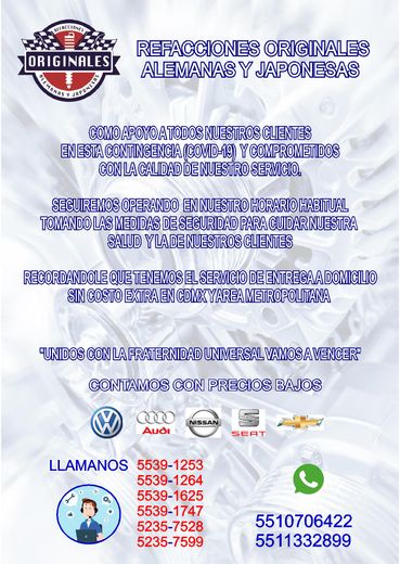 Refacciones Originales, Alemanas y Japonesas es una empresa orgullosamente mexicana dedicada a la comercialización de autopartes y refacciones automotrices originales y de marcas de la mejor calidad proporcionando a nuestros valiosos clientes la mayor satisfacción y demanda en productos y servicio al cliente. Contamos con distintos servicios que nos han distinguido a través de los años y con los cuales hemos logrado ganarnos el cariño y la preferencia de nuestra leal clientela como lo son: nuestras políticas de atención al cliente, nuestro ágil servicio de reparto, nuestro crédito a los clientes más leales y la garantía de conseguir las refacciones que nuestro cliente requiera.